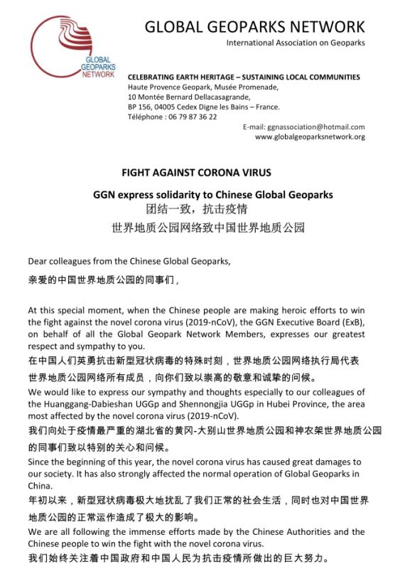 ? ? 在中國人們英勇抗擊新型冠狀病毒的特殊時刻,世界地質(zhì)公園網(wǎng)絡(luò)執(zhí)行局代表世界地質(zhì)公園網(wǎng)絡(luò)的所有成員,向你們致以崇高的敬意和誠摯的問候。